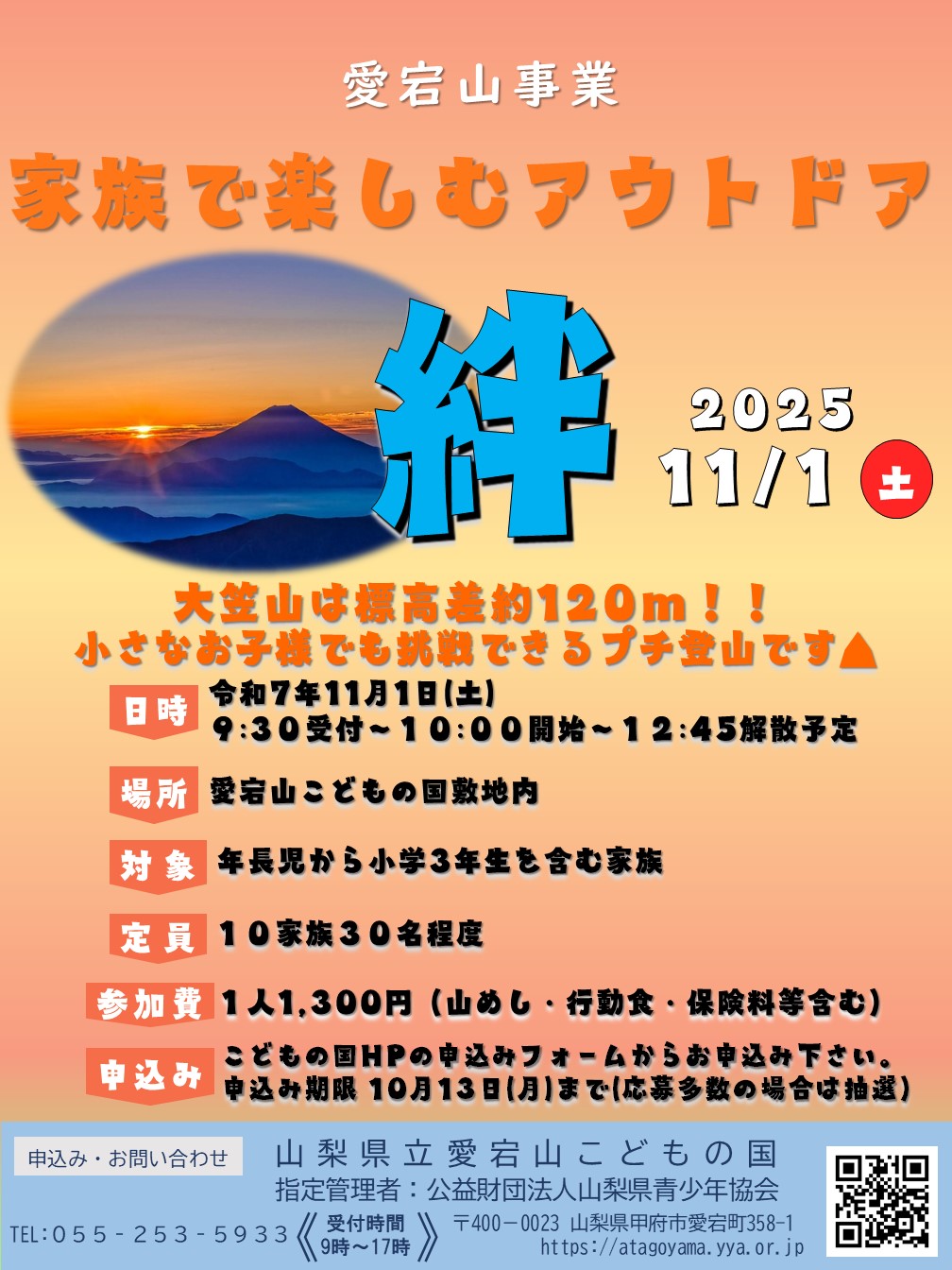 ※申込みが必要なイベントは、実施日の概ね1か月前から詳細を掲載し、募集開始を予定しております。 ※応募多数の場合は抽選となります。 ※募集を開始する際は、LINEでお知らせいたします。 令和7年度 家族で楽しむアウトドア 家族の絆で大笠山 プチ登山に挑戦しよう! 応募はこちらから 応募締切 10月13日まで 令和7年度 自然観察会《秋》 秋の夜長の虫の声♪♫ 夜の公園をいっしょに探してみませんか? 応募はこちらから 応募締切 9月25日まで 令和7年度 イベント案内 いっしょにチャレンジ! わくわくの体験をはじめよう! 自然保育サポート事業 お電話にて受付中 055-253-5933